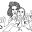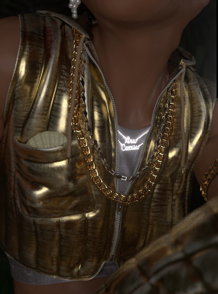 On la trouve le plus souvent vêtue d’un ensemble, pantalon et débardeur, matelassé doré. Elle va pieds nus.